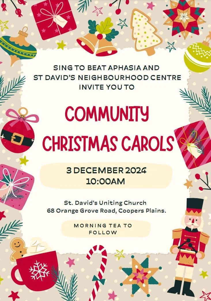 Tuesday 3 December 2024 at 10am: In Person Christmas Concert at St David’s Neighbourhood Centre (68 Orange Grove Road, Coopers Plains) with morning tea to follow!
